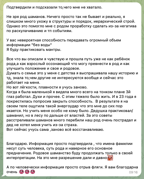 Напишите свою фамилию — и через 48 часов вы получите персональный файл с анализом, архетипом и мантрами-усилителями для ваших ключевых сфер жизни.